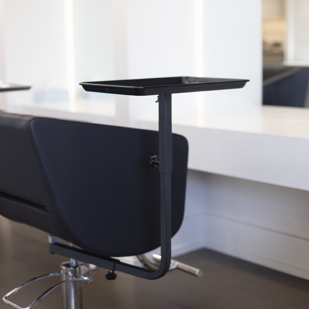 This reinvented salon tray attaches effortlessly to your styling chair's hydraulic piston, bringing style and functionality to your salon. With a 280-degree swivel, it's a stylist's dream, offering easy access to tools, reducing strain, and keeping the floor clutter-free. No wheels, no problem - it's built for durability and cleanliness.